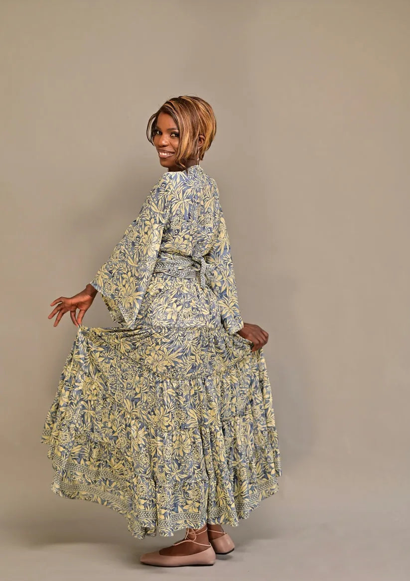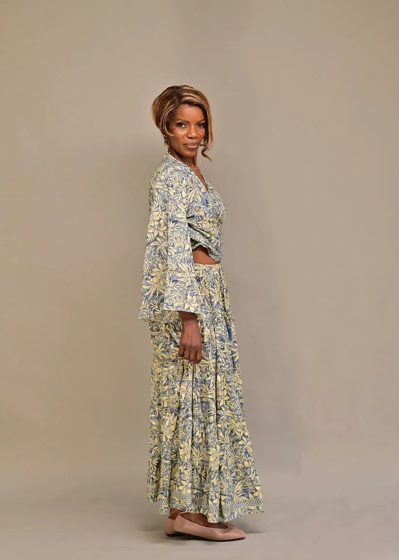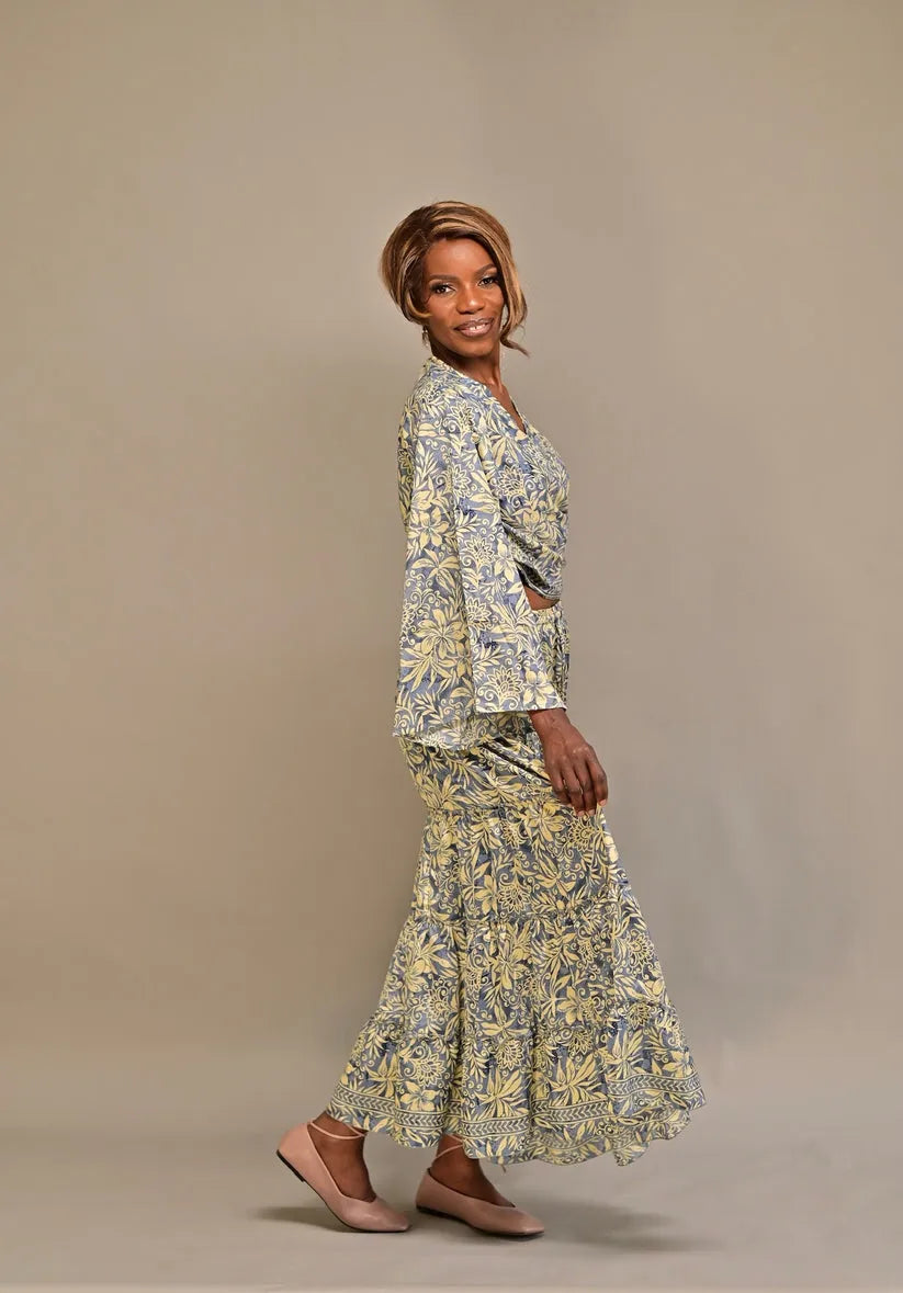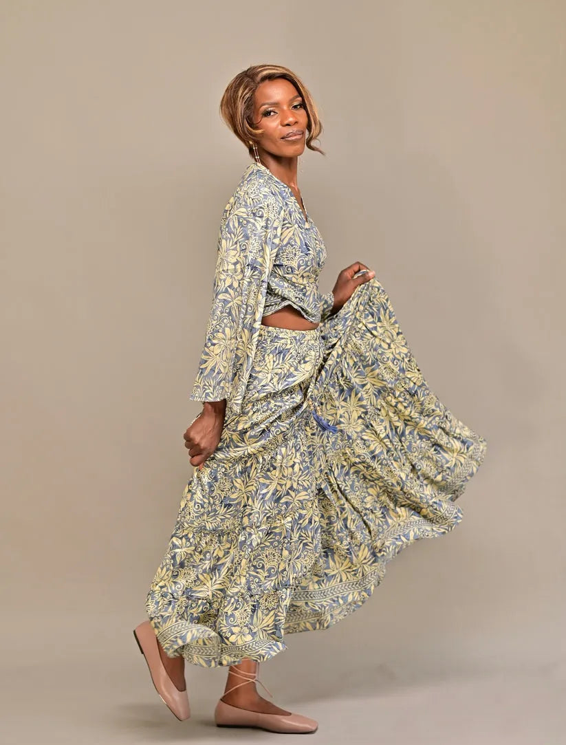 Yellow Blue Silk Two-Piece Set - Long Skirt & Tie Top